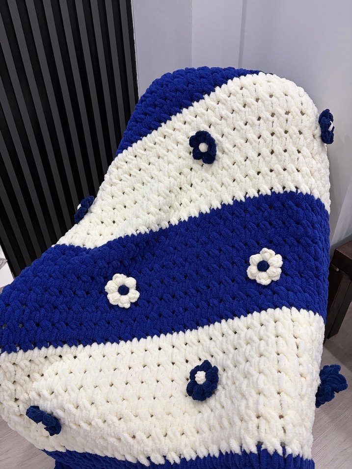 Nakışlı çiçek detaylarına sahip mavi ve beyaz çizgili örgü çocuk battaniyesi, hem sıcak hem de dekoratif bir dokunuş sunar. 110x150