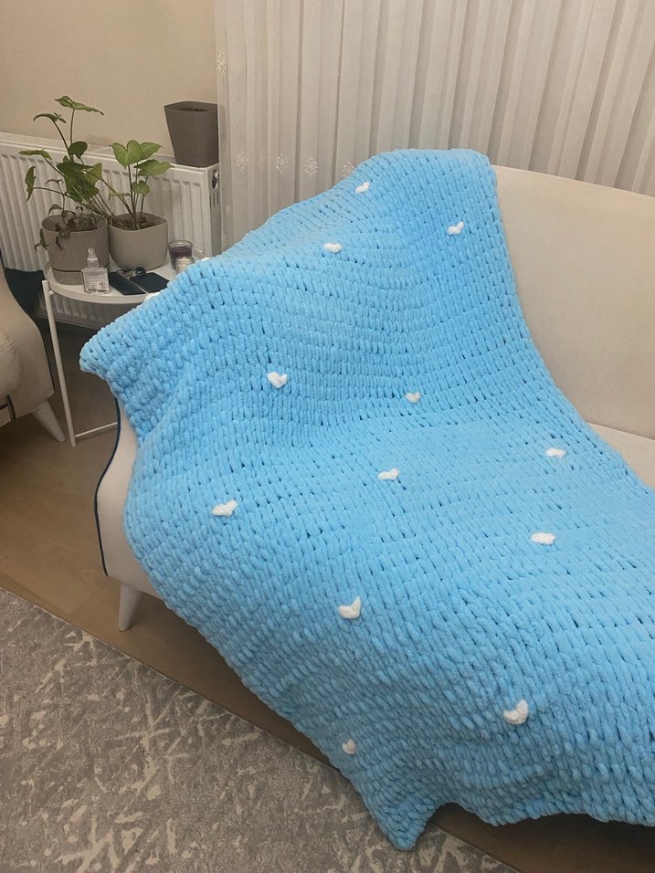 110/160 sevilen renk örülür Pastel mavi renkli, küçük beyaz kalp detaylı örgü çocuk battaniyesi. Yumuşak ve rahat dokusuyla çocukları sıcak tutar.