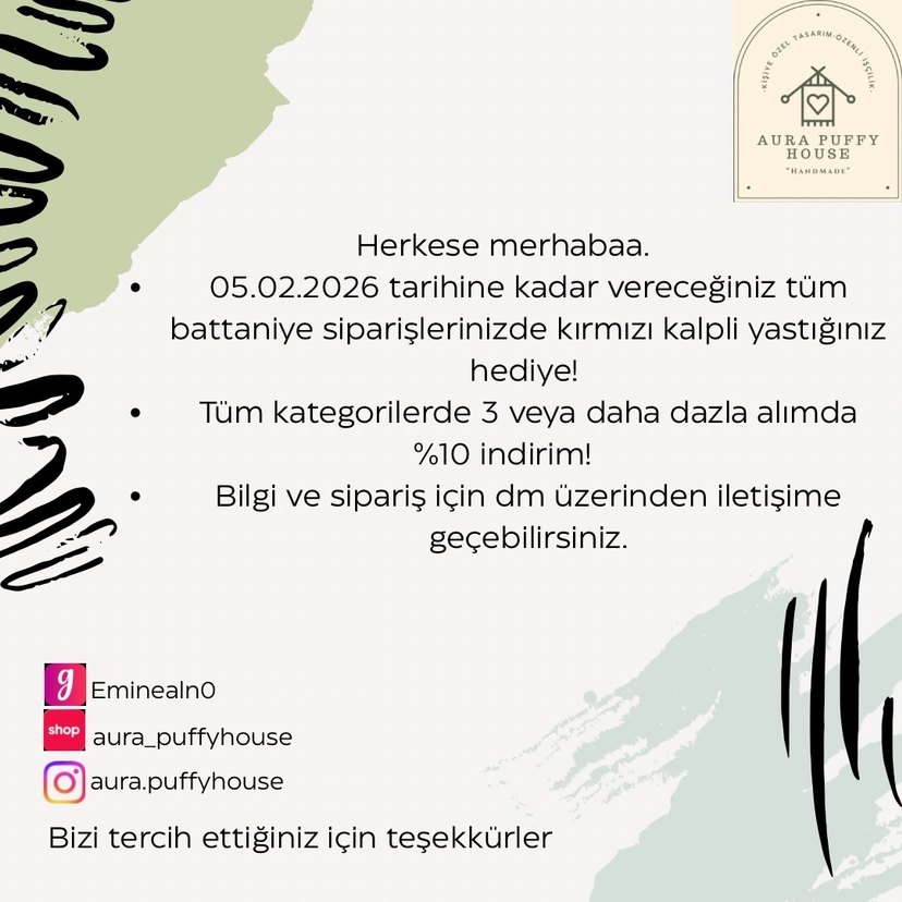 Tercihen gardrops ve shopier'den alım yapıyorum ancak dolap satışlarım da devam ediyor. Sizlere fiyatta yardımcı olabilmem adına bu uygulama veya shopier üzerinden sipariş oluşturabilirsiniz. 5 şubata kadar vereceğiniz tüm battaniye siparişlerinizde kırmızı kalp yastık bizden hediye. Bu fırsatı kaçırmamak için hemen sipariş oluşturabilirsiniz