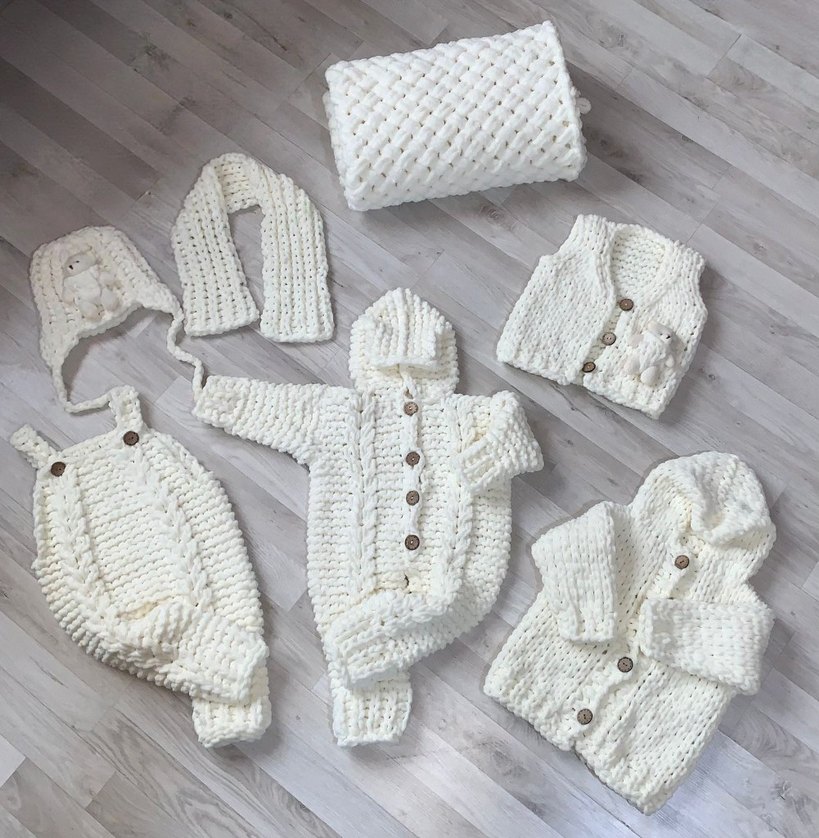 Bohem tarzı, kapüşonlu uzun kollu, yumuşak beyaz örgü kumaştan bebek erkek takımı. Düğmeli hırka ve battaniye içerir.