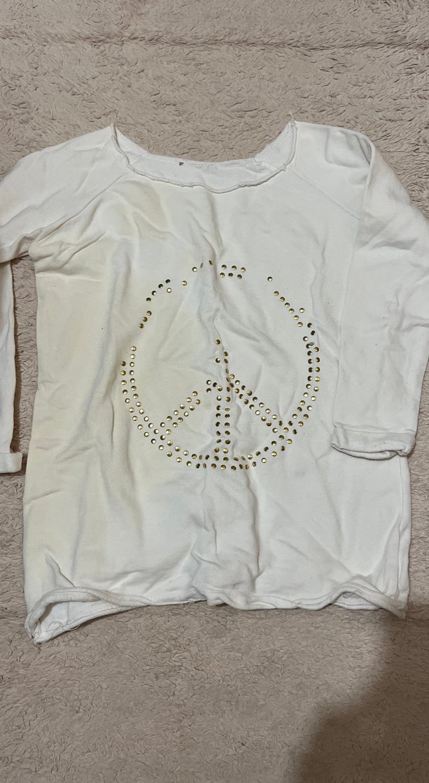 Pamuk kumaştan, uzun kollu, bol kesim beyaz tişört. Önünde pullu barış sembolü baskısı ve yuvarlak yakası vardır. Günlük kullanıma uygundur. ✌️