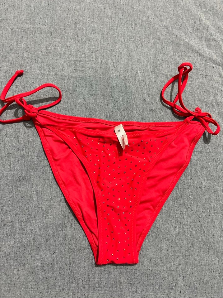 Kırmızı ipli bikini altı, pul detaylarıyla dikkat çeker. Vücuda oturan kesimi ve canlı rengiyle plajda ve sokak stilinde kullanılabilir.