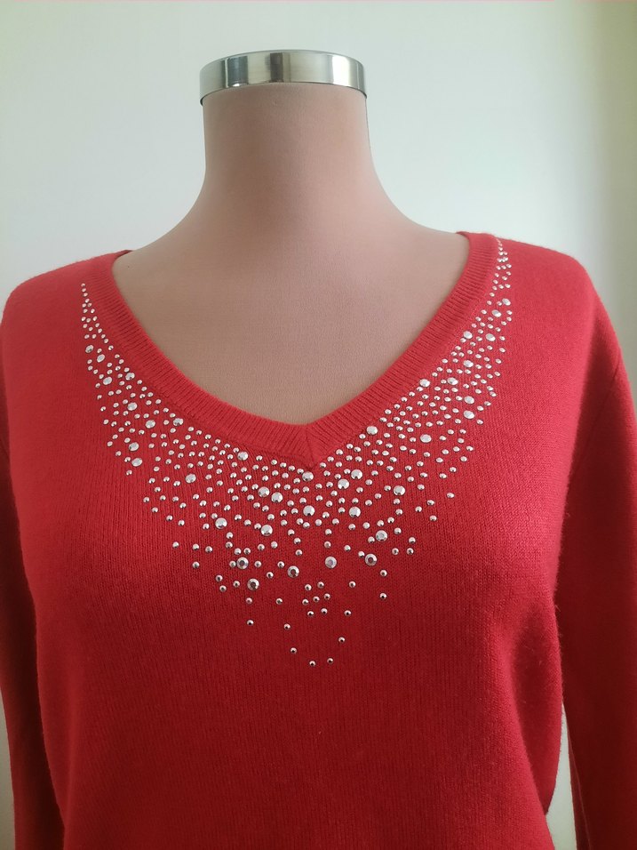 Kırmızı renkli, V yaka ve pul işlemeli nakış detaylı, rahat kesim kadın kazak. Günlük kullanım için şık ve çağdaş bir parça. ✨