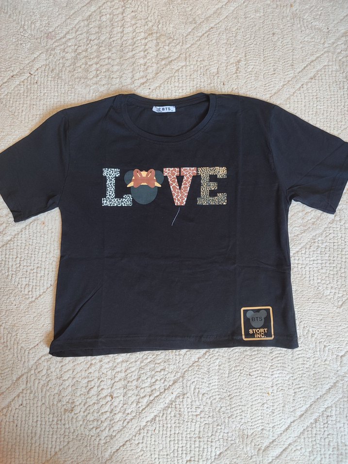 Siyah renk, kısa kollu, yuvarlak yakalı, bol kesim kadın tişörtü. Üzerinde pul işlemeli 'LOVE' baskısı bulunur. Rahat tekstil kumaştan, sokak tarzı için uygundur.