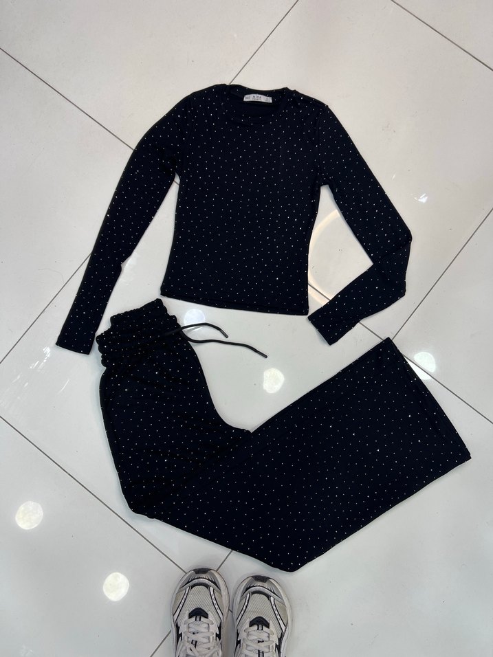 Pul Detaylı Siyah Puantiyeli Kadın Eşofman Takımı