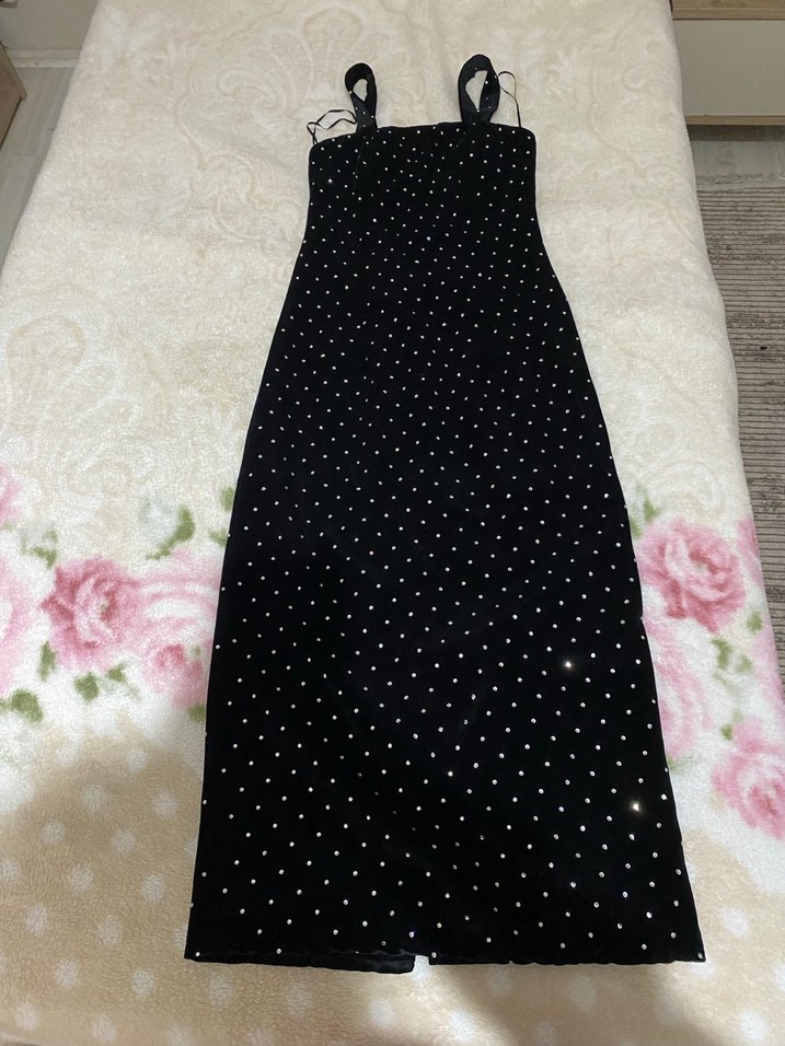 Pul işlemeli puantiyeli, askılı ve straplez yakalı siyah uzun abiye elbise, parti için uygun şık bir modeldir. ✨