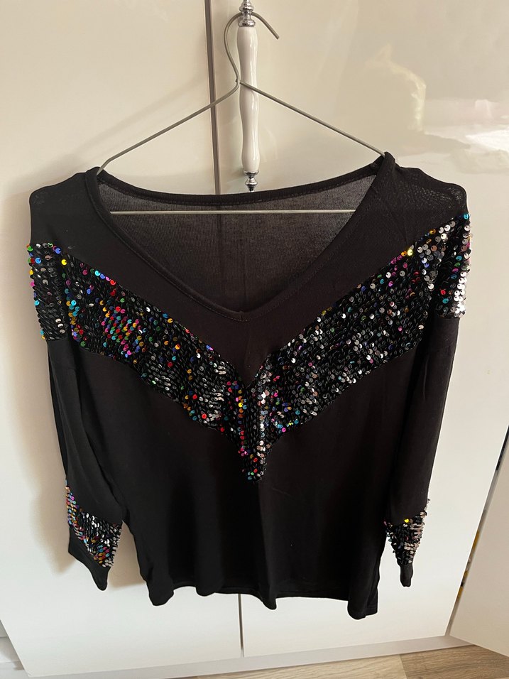 Siyah kadın bluz, V yaka ve uzun kolludur. Renkli pul detaylarıyla desenli, bol kesim, parti ve avangard tarzlar için uygundur. ✨