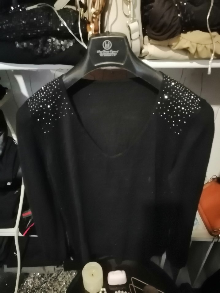 V yakalı, uzun kollu, pul detaylı siyah kadın kazak. Sentetik kumaştan, fitted kesim ve günlük kullanıma uygun.
