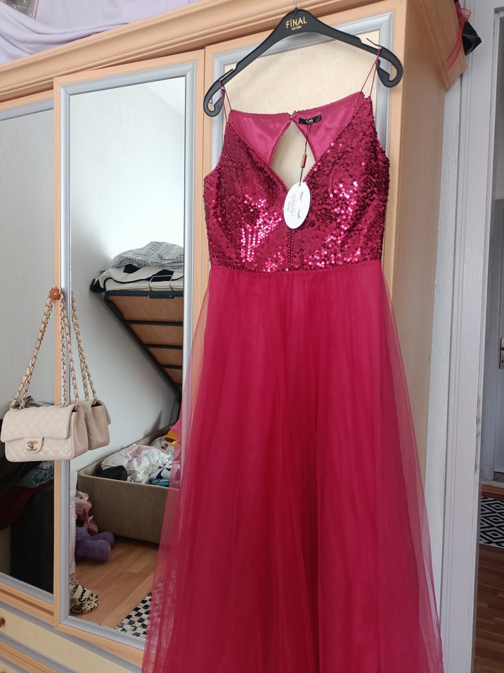 Pul işlemeli, ince askılı, bordo uzun abiye elbise. Üst kısmı vücuda oturan ve bohem tarzda tasarlanmış, ışıltılı ve şık bir model.