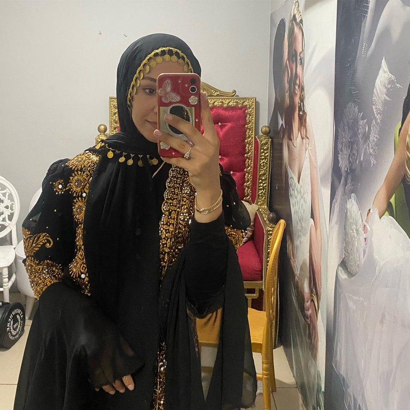 Uzun, dar kesim altın rengi kına elbisesi, pul işlemeli etnik desenlere ve halter yaka ile uzun kollara sahip. Düğünler için uygun. ✨