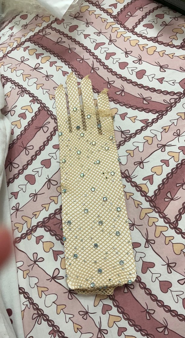 Sentetik kumaştan yapılmış, pul işlemeli bej kadın eldiveni, vintage bohem tarzıyla dikkat çekiyor. ✨