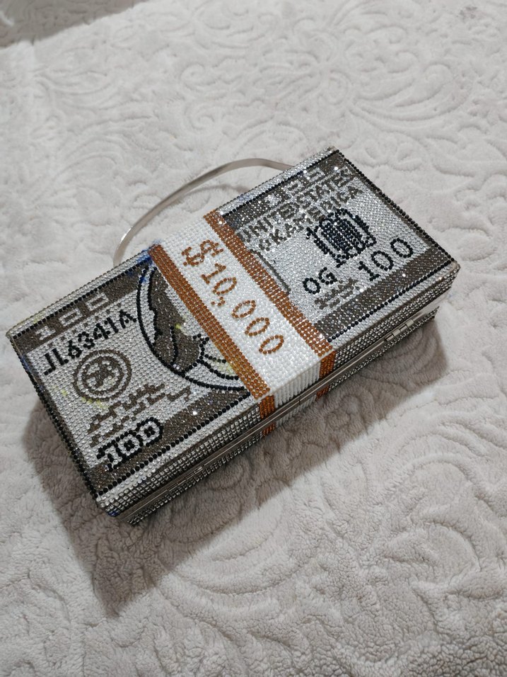 Pul işlemeli, $10.000 banknot desenli gri kadın portföy çanta. Kağıt malzeme ve baskılı desene sahip, vintage ve karşı kültür tarzına uygun günlük kullanım için.