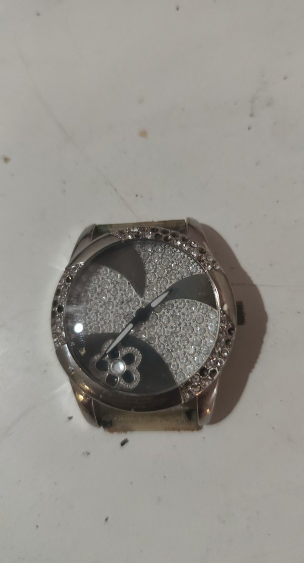 Pul işlemeli detaylara ve kadranda dekoratif çiçek desenine sahip gri kadın saati. Parlak ve vintage tarzda bir tasarım. ⌚