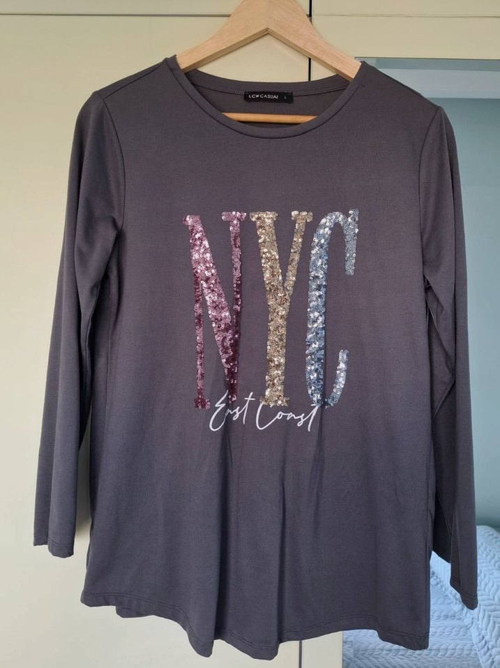 Gri renkte, uzun kollu, yuvarlak yakalı ve bol kesim tişört. Üzerinde pul işlemeli NYC baskısı bulunur, romantik akşamlar için uygun.