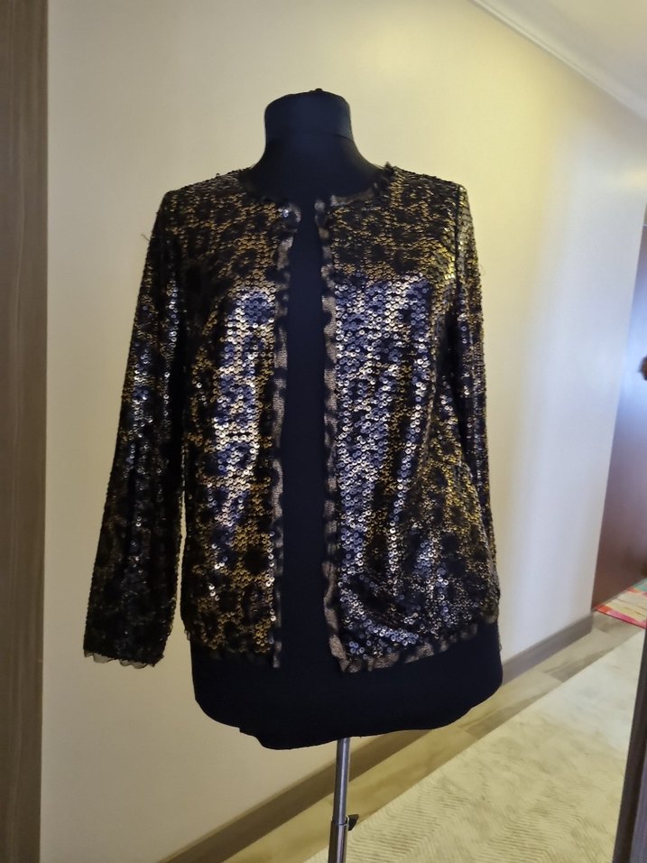 Uzun kollu, bol kesim kadın ceketi, altın renkli pul işlemeli ve yılan desenli, parti için uygundur. ✨