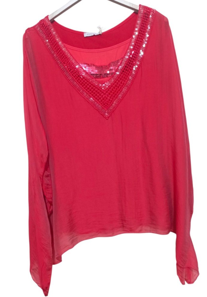 V yaka, uzun kollu, pul işlemeli kırmızı bluz. İpeksi kumaştan, bol kesim, romantik akşamlar için uygun.