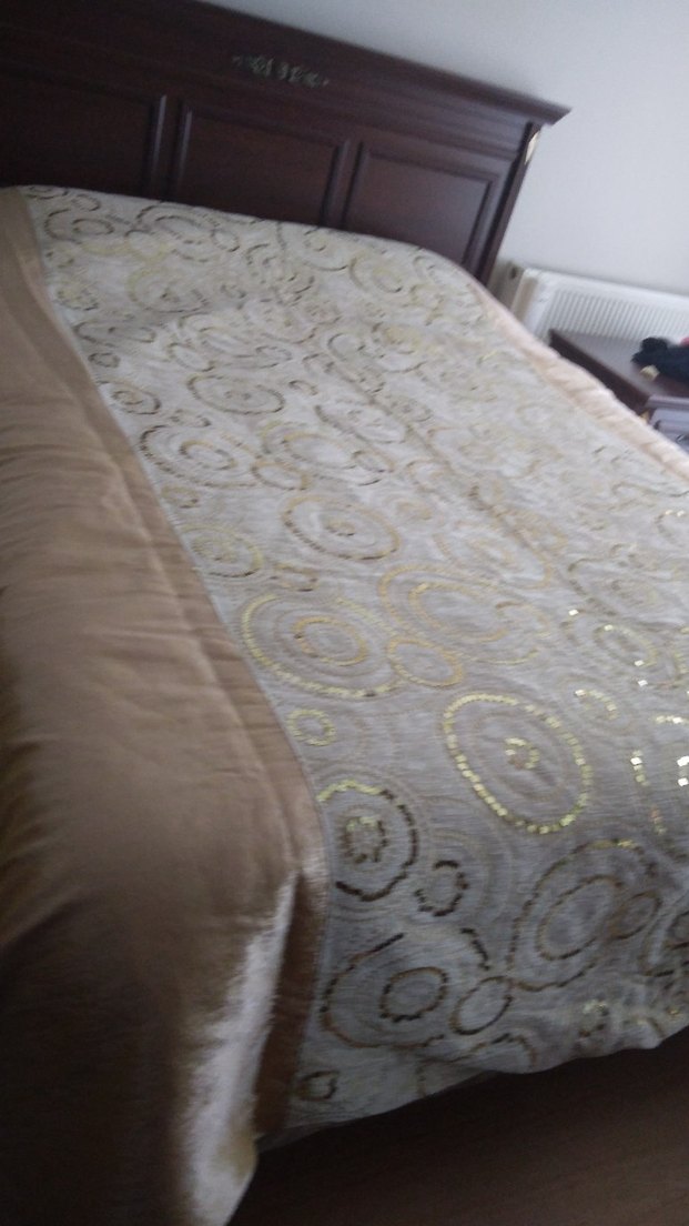 Parlak pullarla işlenmış dairesel işlemeli desenli kapitoneli 2 katlı kalın bej yatak örtüsü. Astarlı astarı keten pamuklu battaniye yerine de kullanılabilir. çok şık yatak odasına zarif bir dokunuş katıyor. ️Hiç kullanılmadı yeni.