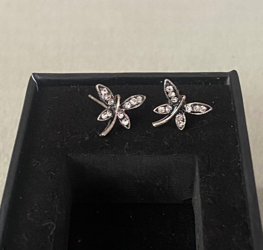 Pul işlemeli kelebek şeklinde mini küpeler, koyu beyaz tonlarda çiçek desenli, romantik akşamlar için uygun.