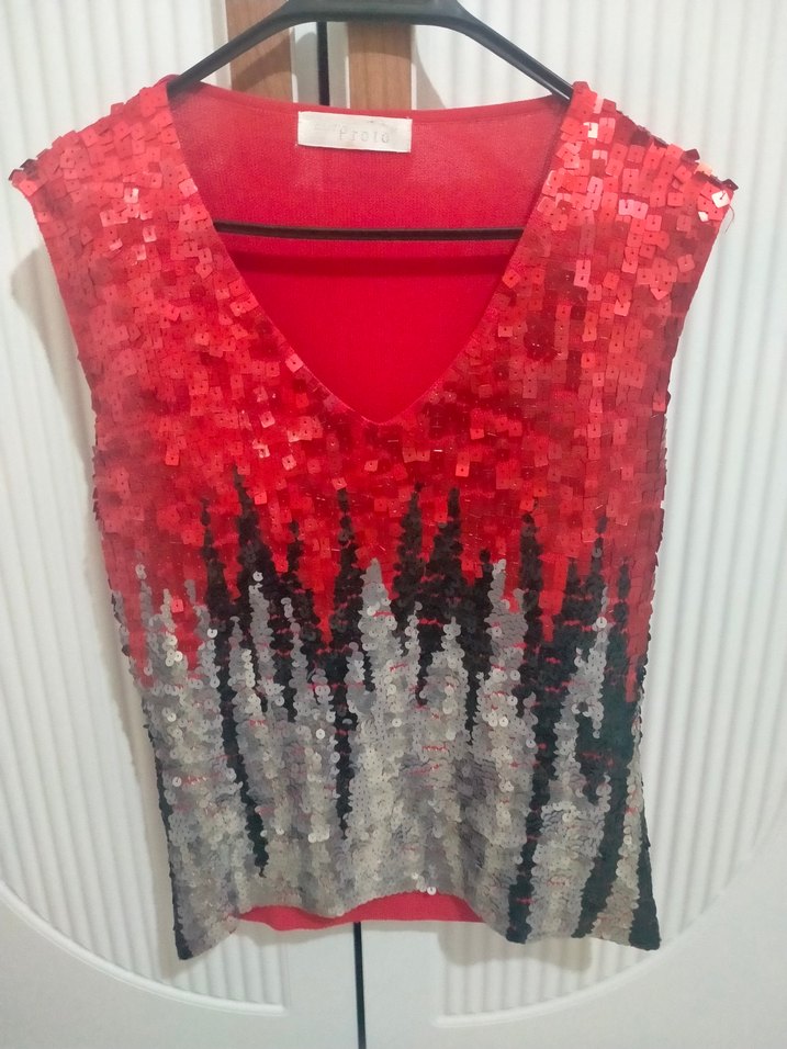 Kırmızı, V yakalı, kolsuz ve vücuda oturan kesime sahip bluz. Renkli pul işlemeleri ve baskılı deseniyle parti ve sokak modasına uygun. ✨