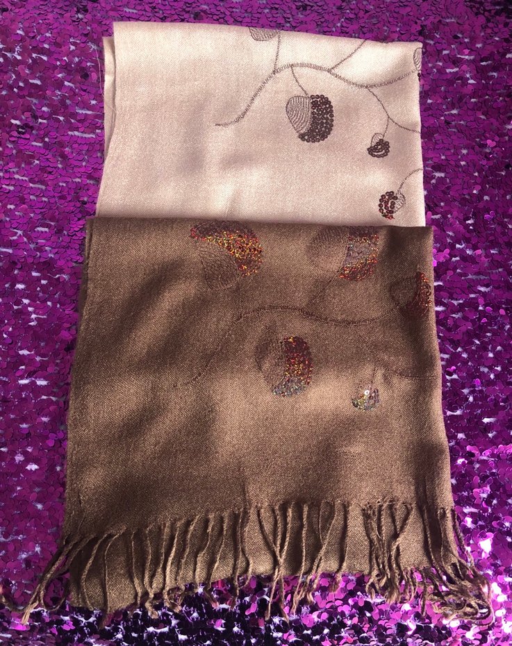 Pul İşlemeli Krem-Kahverengi Yünlü Kadın Şal