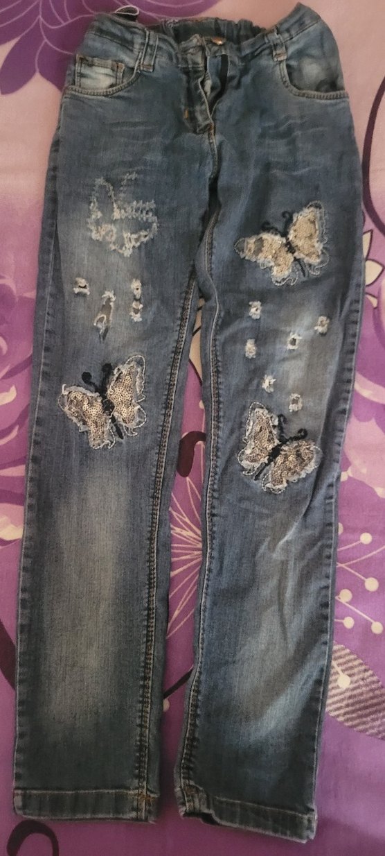 Mavi kot pantolon, loose fit, pul işlemeli kelebek nakışlarıyla günlük rahat kullanım için uygundur.