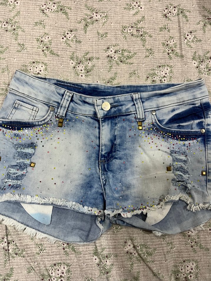 Pul işlemeli, yıpratma detaylı, açık mavi renk mini kot şort, günlük kullanıma uygun rahat kesim.