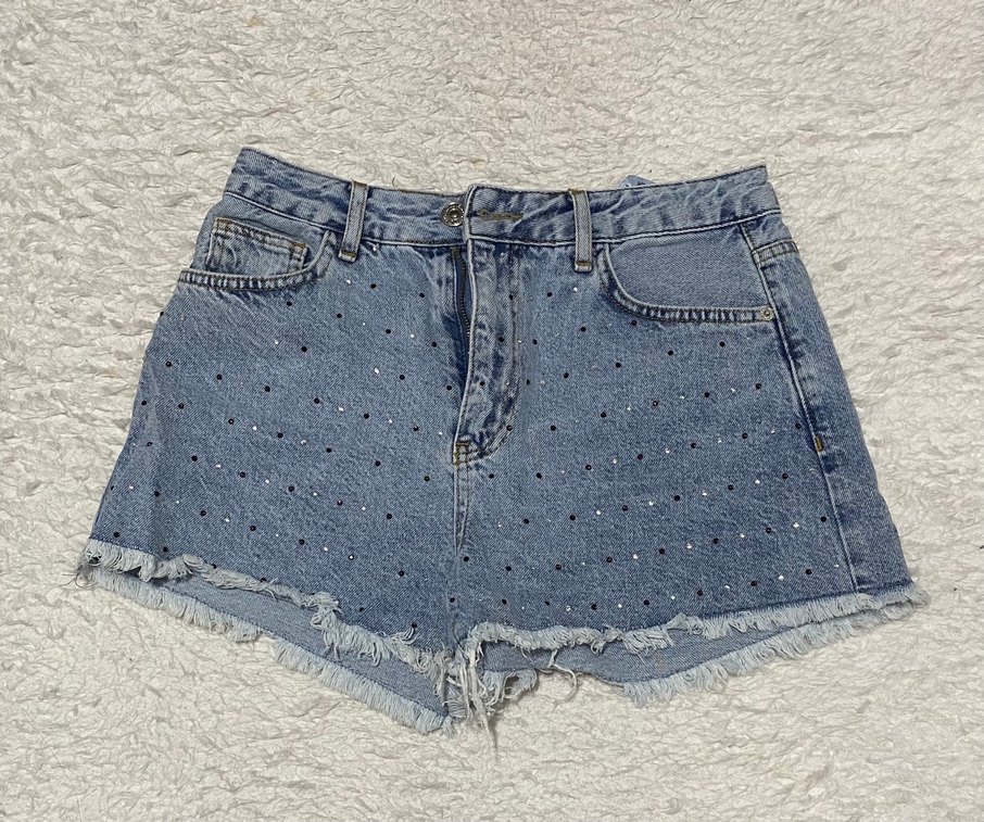 Pul işlemeli ve nakış detaylı mavi kot şort, bol kesim ve yıpratılmış kenarlarla rahat bir görünüm sunar.