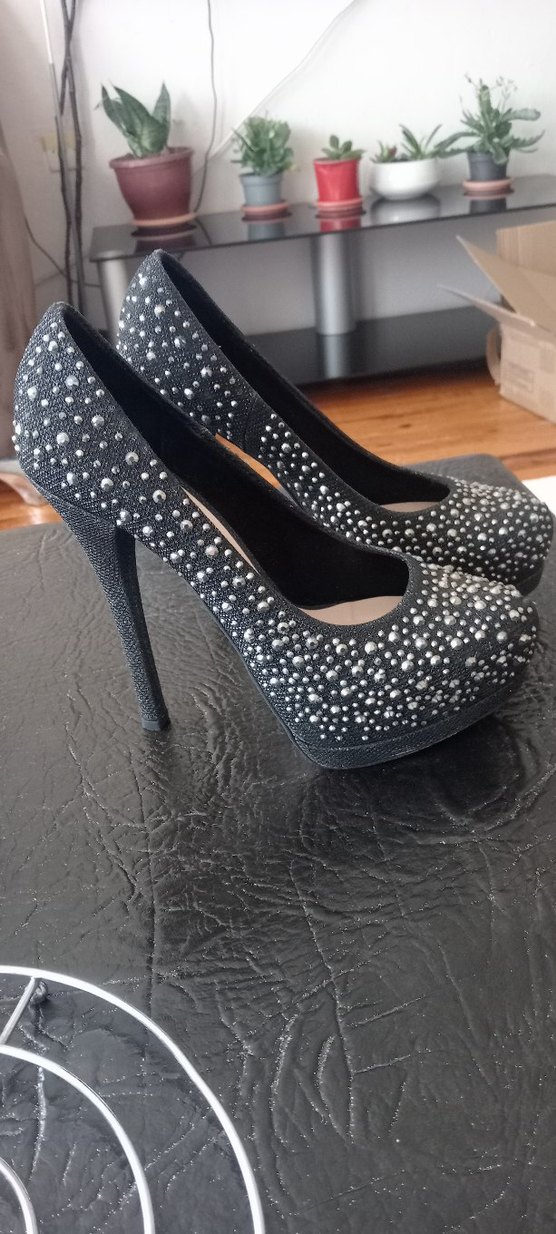 Pul işlemeli desenli siyah platform topuklu ayakkabı, yüksek platform ve desen detaylarıyla göz alıcı. Romantik akşamlar için uygun. Topuk 13.5 cm
