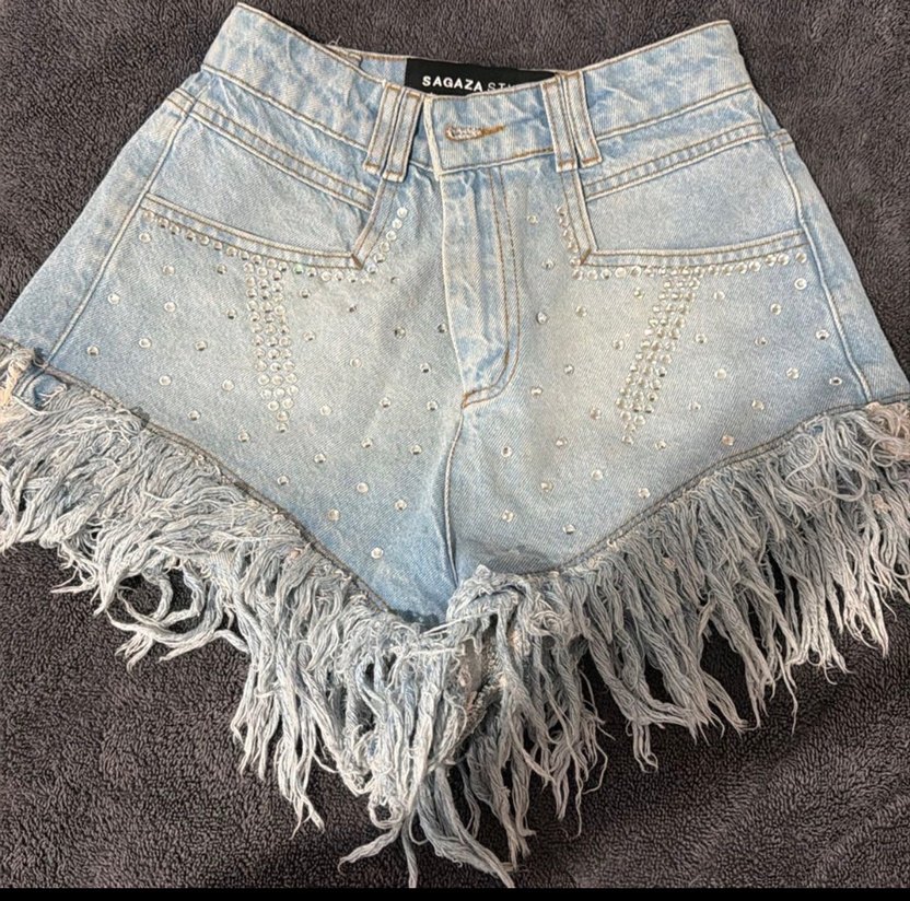 Pul İşlemeli Püsküllü Mini Denim Şort