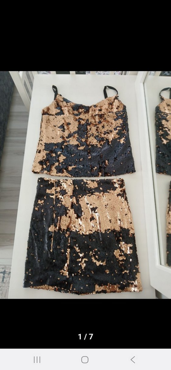 Siyah ve altın pul işlemeli, straplez askılı, mini ve dar kesim etek - bluz,