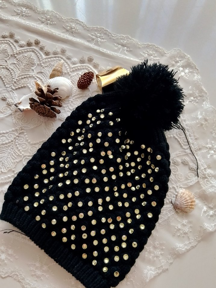 Pul işlemeli siyah örme bere, ponponlu ve rahat bir retro stile sahip. Bohem ve hippie görünüme uygun. ❄️