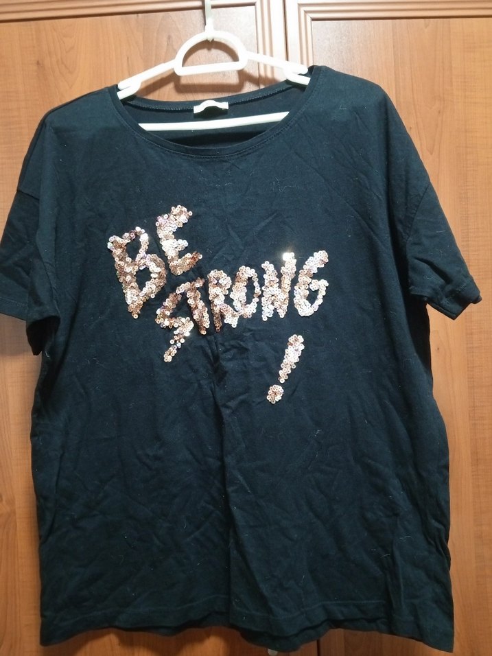 Siyah denim kısa kollu, rahat kesim kadın tişörtü. Önünde pul işlemeli "BE STRONG!" yazısı bulunur. Yuvarlak yakalı. Etikette M beden yazıyor ama rahatlıkla bol olarak L hatta xL bile olur. Bir kaç kez giyildi siyahı koyu.