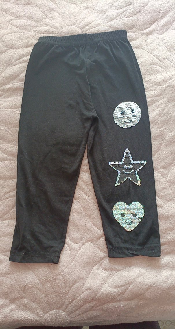 Siyah, rahat kesim ve yumuşak sıcak kumaştan kız taytı. Pul işlemeli gülen yüz, yıldız ve kalp nakışlarıyla sokak stiline uygun.