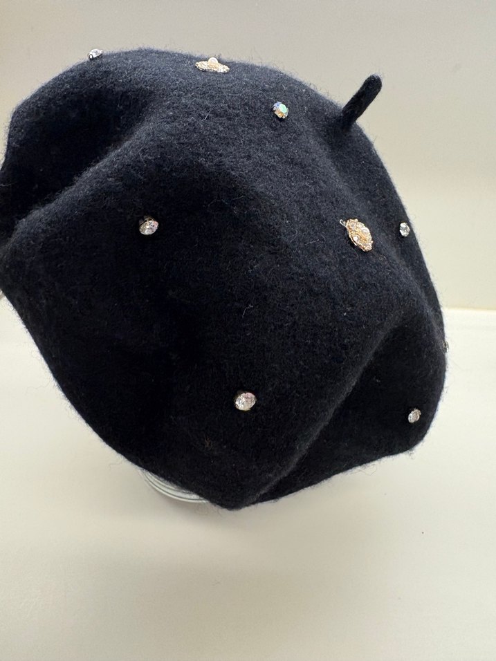Pul işlemeli siyah yün beret, Paris goth tarzıyla avangart dokunuşu birleştirir. Moda öncüleri için ideal. M beden,55-56sm.90% yun