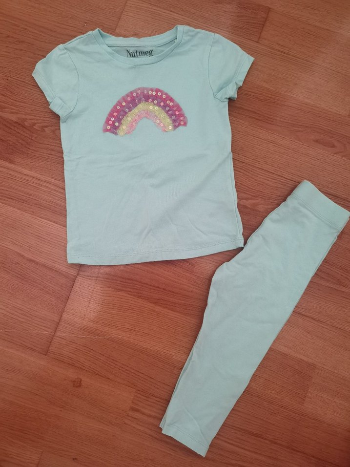 Pul işlemeli gökkuşağı baskılı, kısa kollu, turkuaz renkli, yumuşak ve sıcak kumaştan bebek kız takımı.