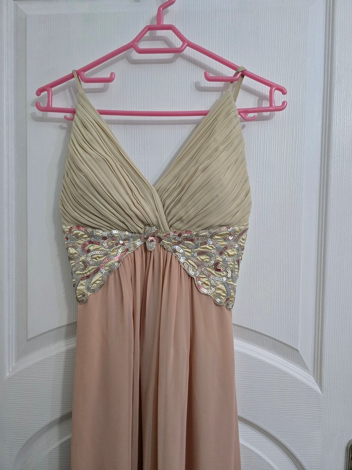Pul işlemeli, askılı, sırt fermuarlı, şifon abiye elbise. Herhangi bir yırtık sökük yok sorunsuz. Şık ve zarif bir elbise. Göğüs kaplıdır, sütyensiz kullanılabilir.