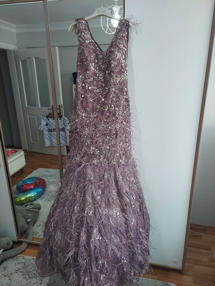 V yaka ve kolsuz, pul işlemeli ve nakışlı uzun mor, vücuda oturan elbise. Parlak ve göz alıcı, düğünler için uygun. ✨xxl 44 beden