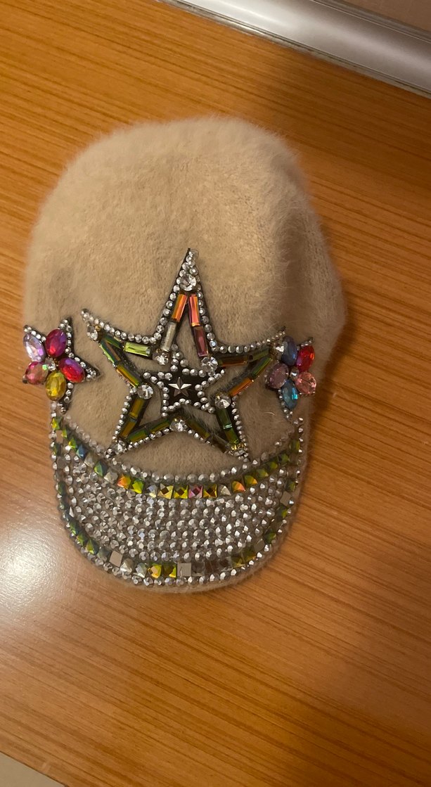 Yumuşak dokulu açık renk yünden kadın şapka, pul işlemeli yıldız ve çiçek detaylarıyla süslenmiştir. Canlı süslemelerle dikkat çeker. ✨