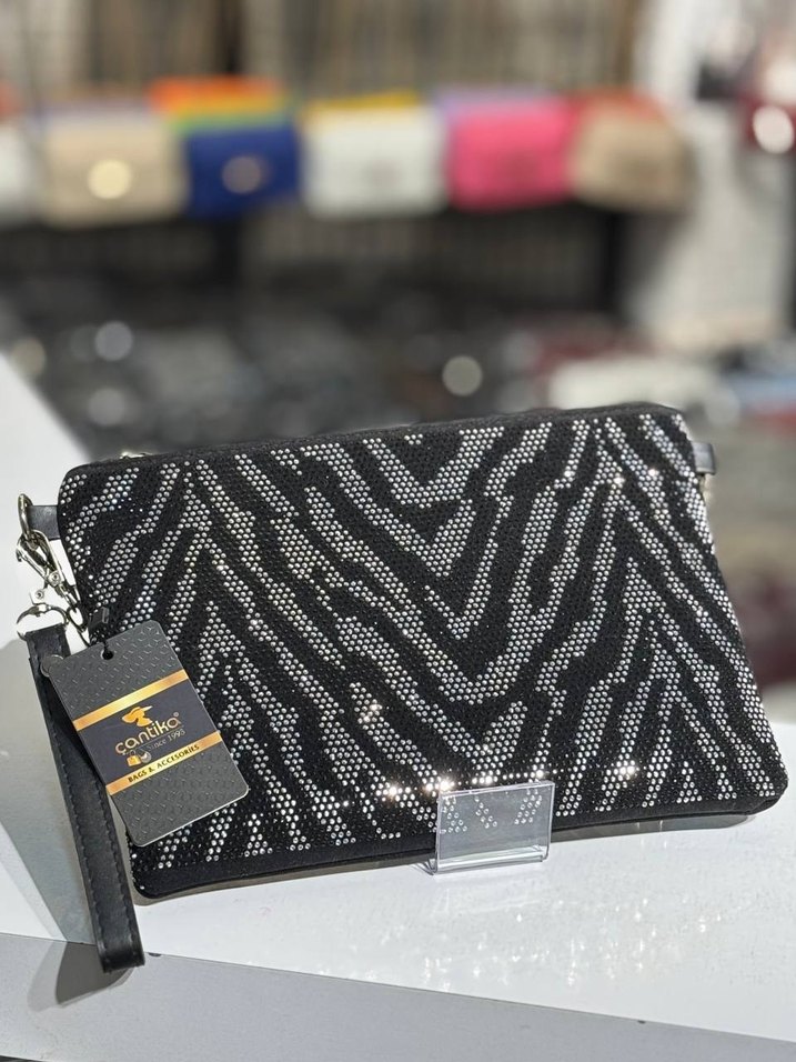 Pul işlemeli zebra desenli siyah kadın portföy çanta, sentetik kumaştan olup günlük kullanıma uygun klasik şıklık ve sokak stili sunar.