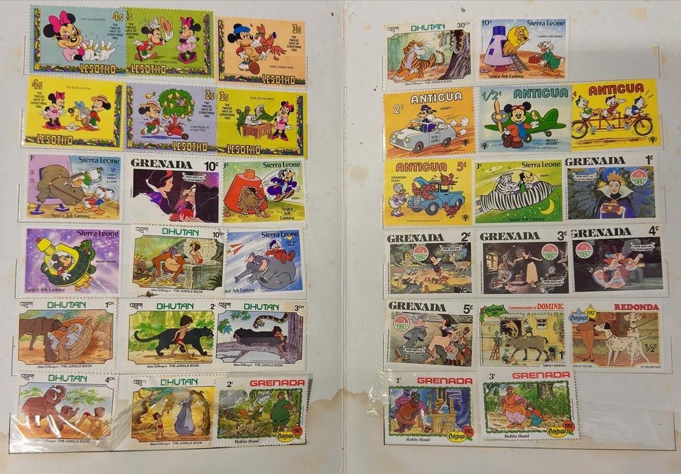 Lesotho, Bhutan, Antigua, Sierra Leone ve Grenada gibi ülkelerden çocuk çizgi film karakterlerini içeren renkli pul koleksiyonu. Pul albümünde düzenlenmiş.
