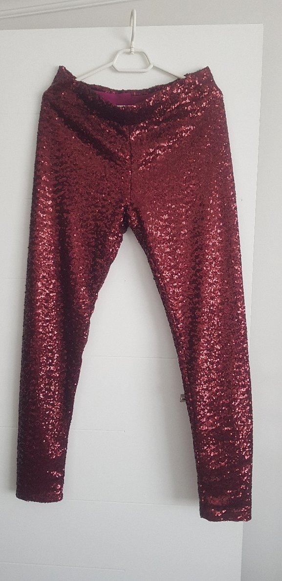 Parlak sentetik kumaştan yapılmış, midi boy, ışıltılı bordo kadın tayt. Cesur sokak stili ve parti kombinleri için uygundur.✨