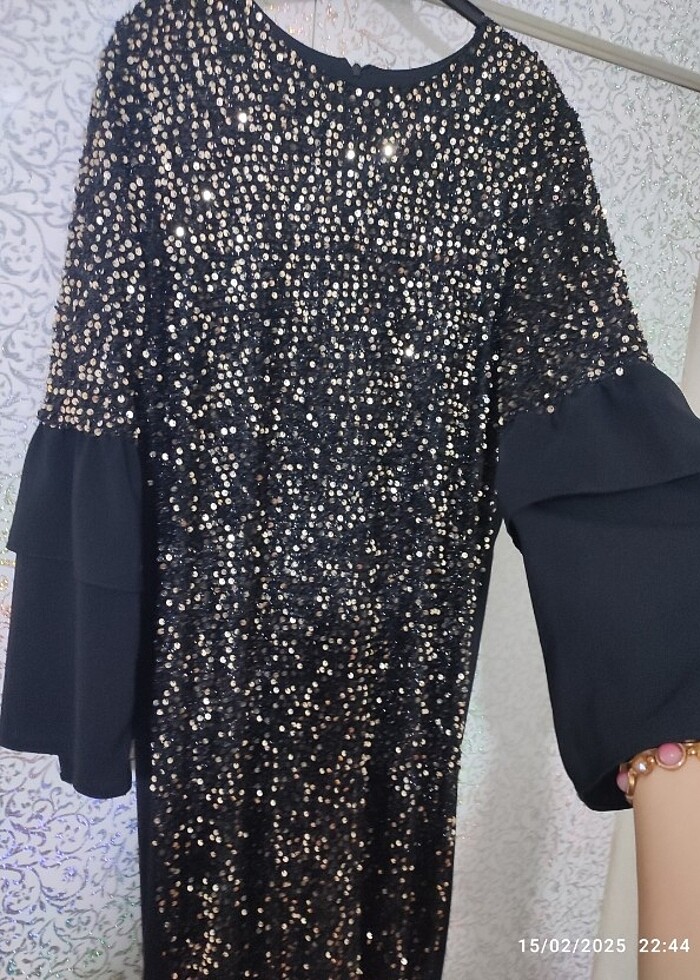 Acıklamayı lütfen okuyun. Ürün defosuz. 44 bedendir. Balık model elbise Ucları hafif pile ve katlı kollarıda ise aynı şekilde katlıdır. Elbisenin arkası pullu değildir.