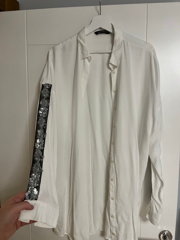 Yumuşa keten kumaştan, beyaz uzun kollu, düğmeli ve yakalı payet detaylı gömlek. Rahat kesimiyle günlük sokak stiline uygundur. 42 bedendir.