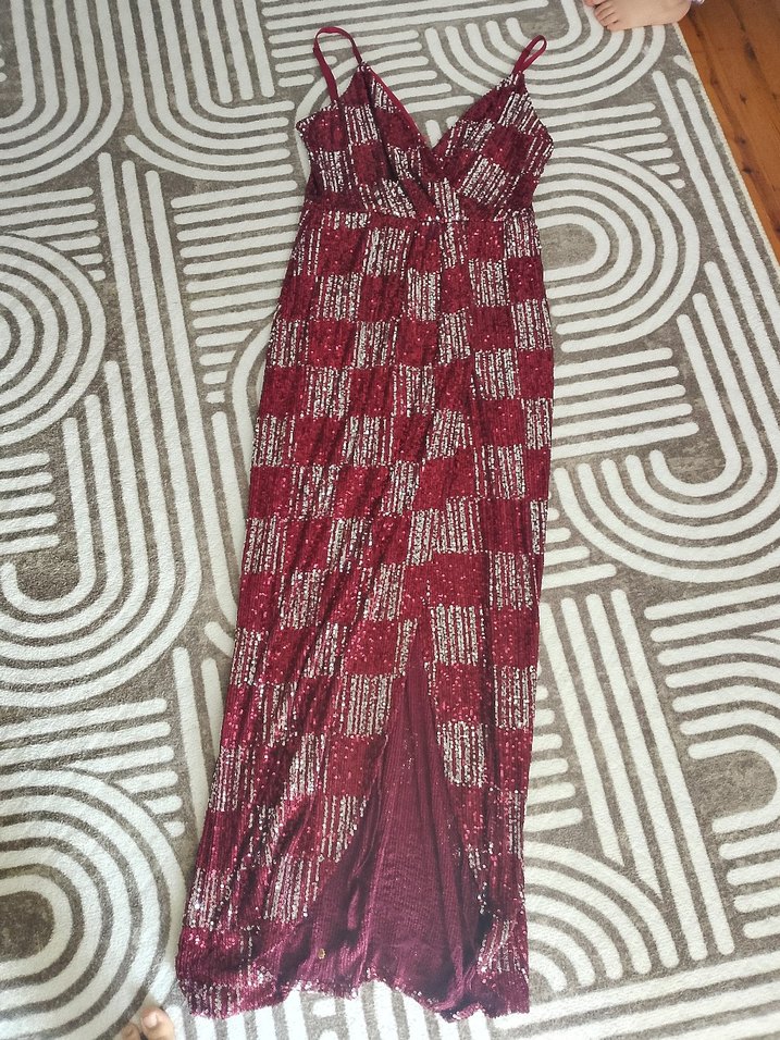 Bordo renkli, drapeli detaylara sahip uzun elbise, parlak batik deseniyle dikkat çeker. İnce askılı, V yakalı ve bohem tarzda, düğün nişaniçin uygundur.