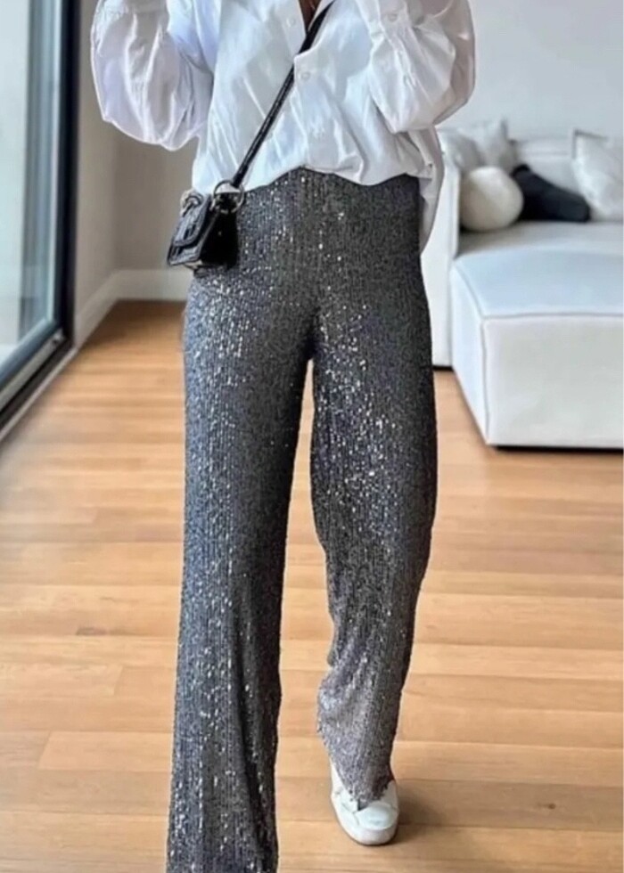Yüksek bel beli lastikli pul payetli gümüş gri tasarım pantolon YENİ 36-38-40 bedene kadar uyumludur beli lastikli olduğu için dökümlü duruş vardır