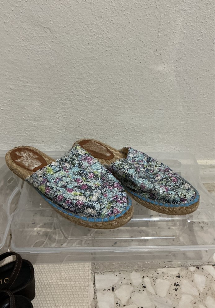 Kadın espadril, renkli pastel batik desenli ve dolgu topuklu. Kauçuk tabanlı ve cırt cırtlı, günlük kullanım için bohem tarzda.
