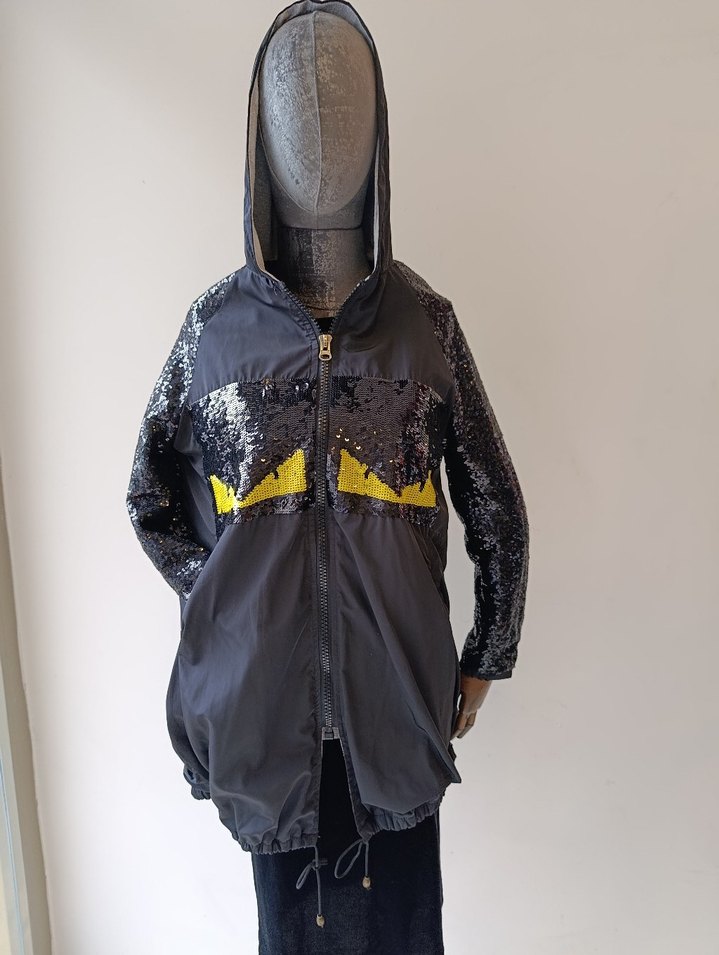 Pul payetli,kapüşonlu, fermuarlı ve bol kesim yağmurluk. Sentetik kumaştan, siyah renkte ve pul detaylıdır. Sokak stiline uygundur. ️S M L bedenleri mevcuttur