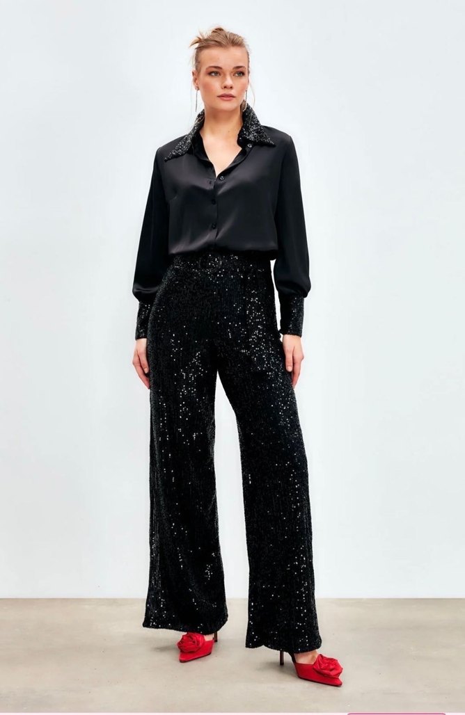 Pul Payetli Tasarım Pantolon Siyah