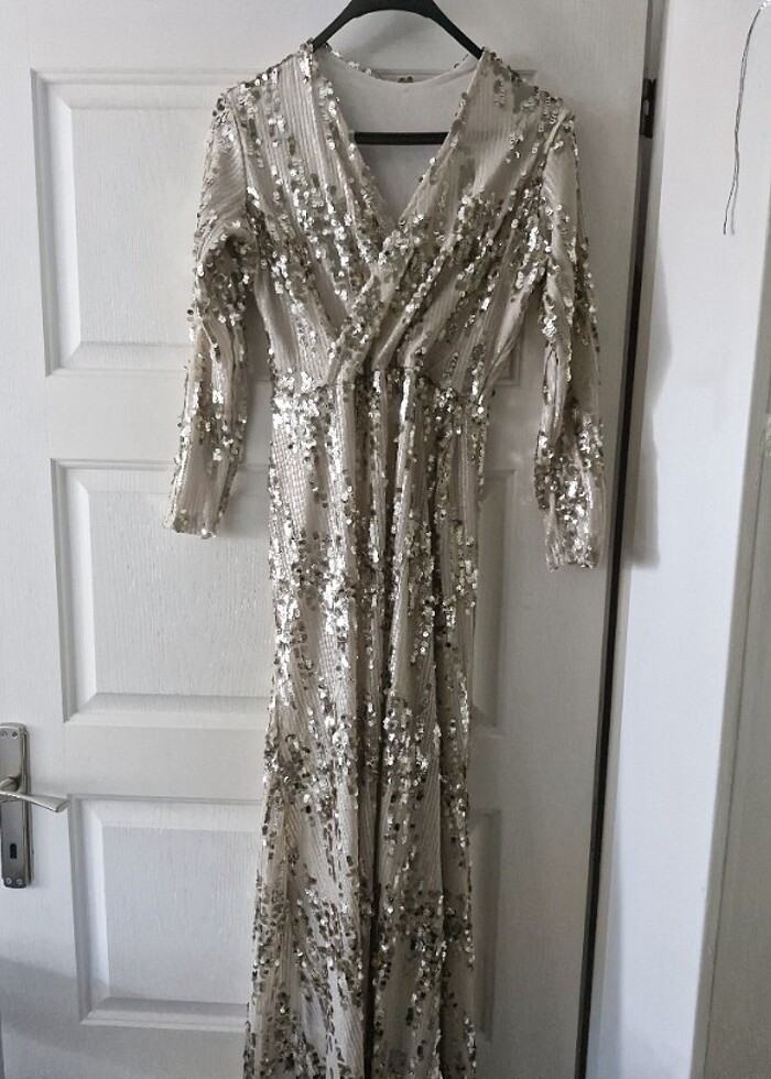 Pul payetli elbise V yaka Kolları astarli, ic göstermeyen bir kumaşı var. 36 38 s/m beden uyumlu, normalde a kesim iniyor ama 38 bedenseniz ve baseniniz varsa yapısabilir. Bel 40 cm Boy 1.42 cm İki koltukalto arası 40 cm