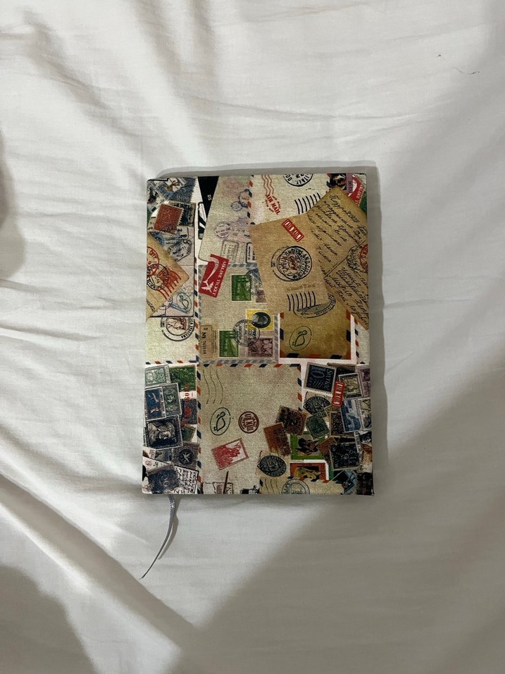 Çeşitli eski pullar ve mektuplarla süslenmiş kapaklı sanat defteri, çizim veya günlük tutmak için uygundur. ✍️
